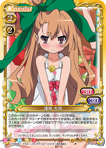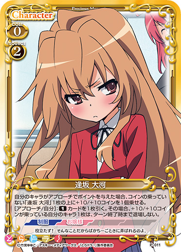 | 自分のキャラがアプローチでポイントを与えた場合、コインの乗っていない「逢坂 大河」1枚の上に+10/+10コインを1個乗せる。 [アプローチ/自分]:《1》カードを1枚引く。その場合、+10/+10コインが乗っている自分のキャラ1枚は、ターン終了時まで退場しない。 | ||