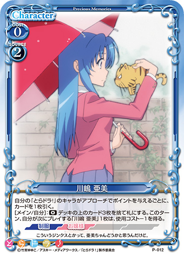 | 自分の「とらドラ!」のキャラがアプローチでポイントを与えるごとに、カードを1枚引く。 [メイン/自分]:《0》デッキの上のカード3枚を捨て札にする。このターン、自分が次にプレイする「川嶋 亜美」1枚は、使用コスト-1を得る。 | ||