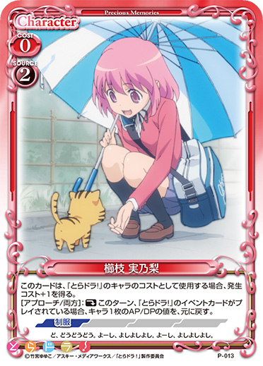 | このカードは、「とらドラ!」のキャラのコストとして使用する場合、発生コスト+1を得る。 [アプローチ/両方]:《休》このターン、「とらドラ!」のイベントカードがプレイされている場合、キャラ1枚のAP/DPの値を、元に戻す。 | ||