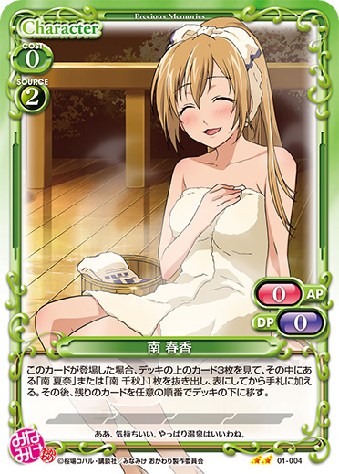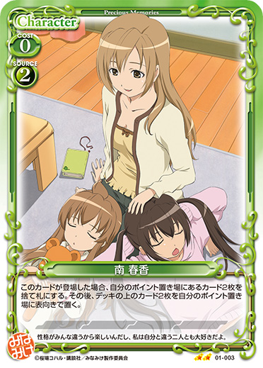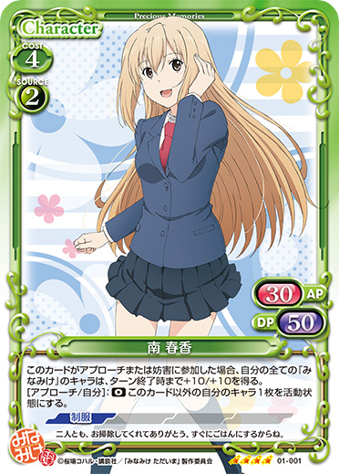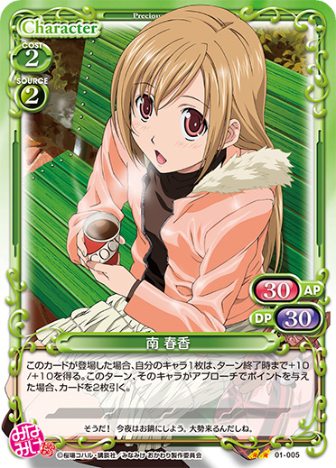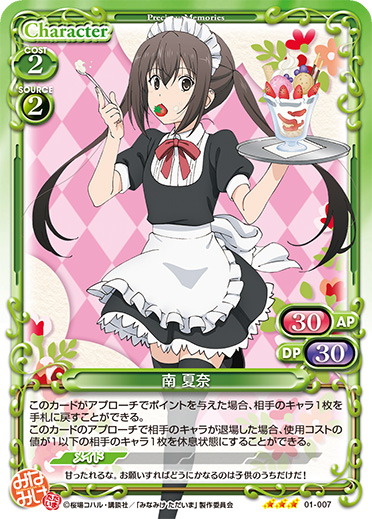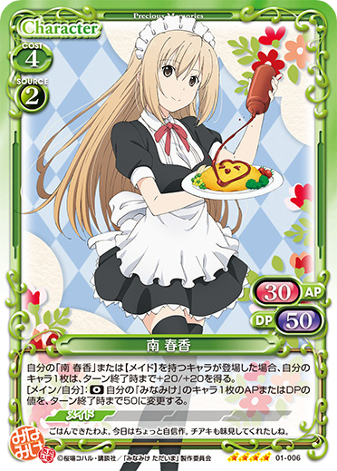 | 自分の「南 春香」または【メイド】を持つキャラが登場した場合、自分のキャラ1枚は、ターン終了時まで+20/+20を得る。[メイン/自分]:《0》自分の『みなみけ』のキャラ1枚のAPまたはDPの値を、ターン終了時まで50に変更する。 | ||