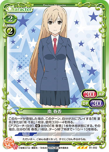 | このカードが登場した場合、このターン、自分が次にプレイする「南 夏奈」または「南 千秋」1枚は、使用コスト-4を得る。[アプローチ/自分]:《0》自分の「南 春香」1枚を休息状態にする。その場合、自分の「南 春香」1枚は、ターン終了時まで+10/+10を得る。 | ||