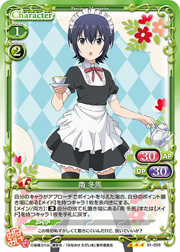 | 自分のキャラがアプローチでポイントを与えた場合、自分のポイント置き場にある【メイド】を持つキャラ1枚を表向きにする。[メイン/両方]:《3》自分の捨て札置き場にある「南 冬馬」または【メイド】を持つキャラ1枚を手札に戻す。 | ||