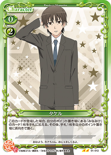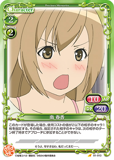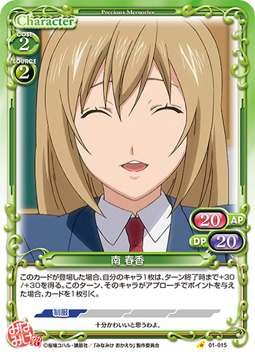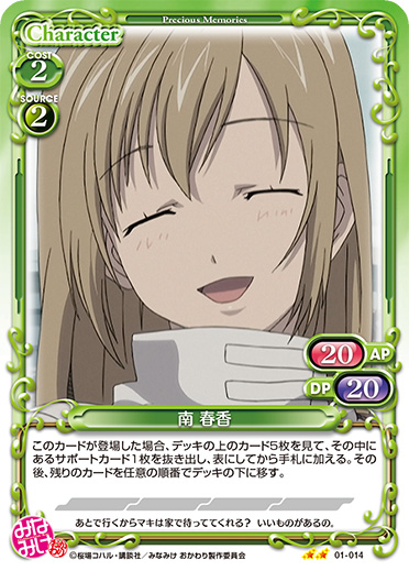 | このカードが登場、または退場した場合、自分の捨て札置き場にある『みなみけ』のキャラ3枚を、任意の順番でデッキの下に移す。その場合、自分のポイント置き場にあるカード1枚を表向きにすることができる。 | ||