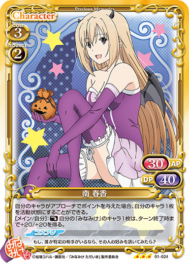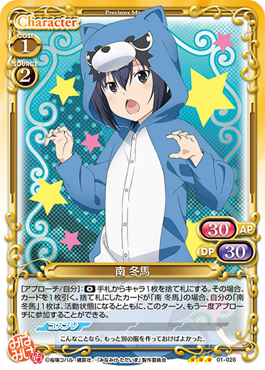 | 自分の『みなみけ』のキャラがアプローチでポイントを与えた場合、ターン終了時にカードを1枚引く。このカードがアプローチに参加した場合、このカードと、このカード以外の『みなみけ』のキャラ1枚は、ターン終了時まで+20/+20を得る。 | ||