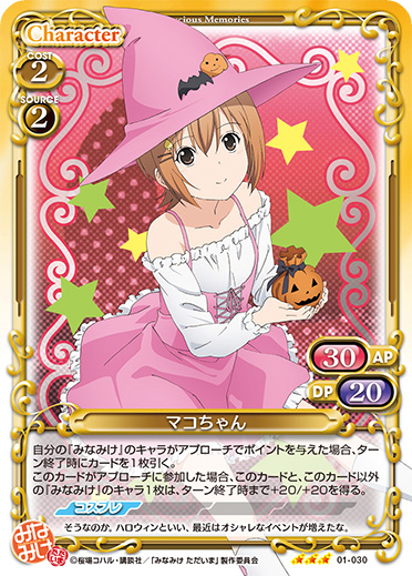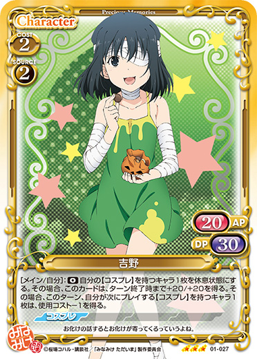 | [メイン/自分]:《0》自分の【コスプレ】を持つキャラ1枚を休息状態にする。その場合、このカードは、ターン終了時まで+20/+20を得る。その場合、このターン、自分が次にプレイする【コスプレ】を持つキャラ1枚は、使用コスト-1を得る。 | ||