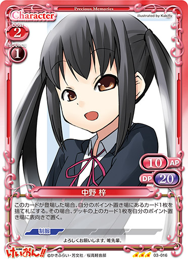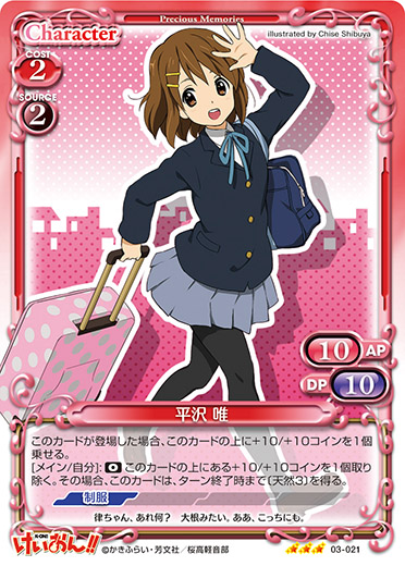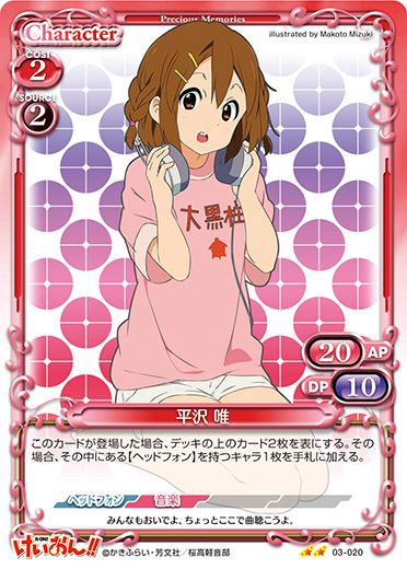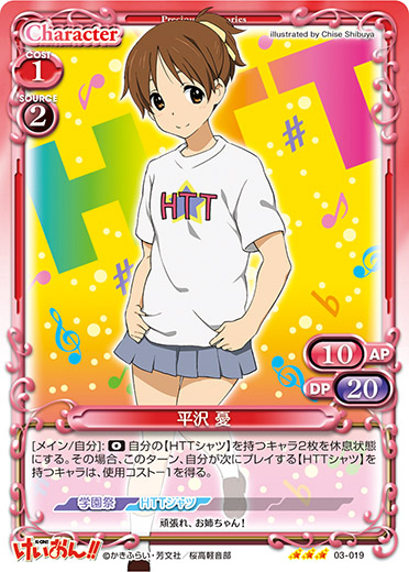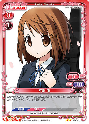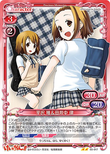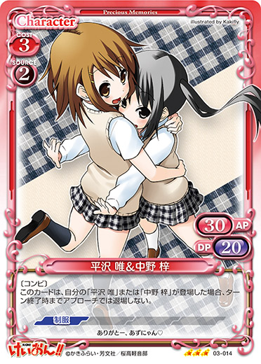 | 〔コンビ〕 このカードは、自分の「平沢 唯」または「中野 梓」が登場した場合、ターン終了時までアプローチでは退場しない。 | ||