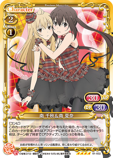 | [アプローチ/両方]:《休》このカードをデッキの下に移す。その場合、自分の『みなみけ』のキャラ1枚は、ターン終了時まで+20/±0を得る。 | ||