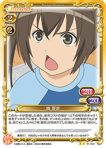 | このカードが登場した場合、使用コストの値が1以下の相手のキャラ1枚をデッキの下に移す。その後、デッキの上のカード3枚を捨て札にする。捨て札にした中に「南 夏奈」が含まれていた場合、カードを1枚引く。 | ||
