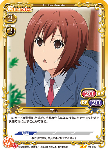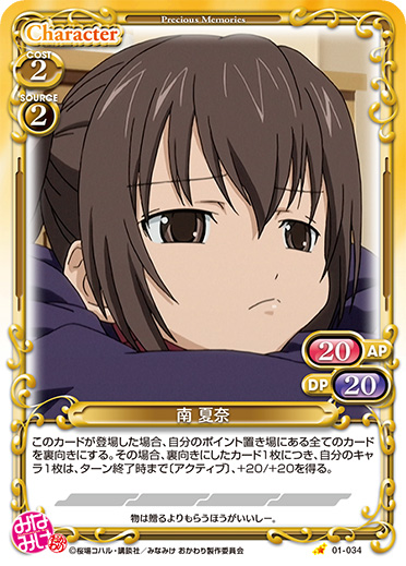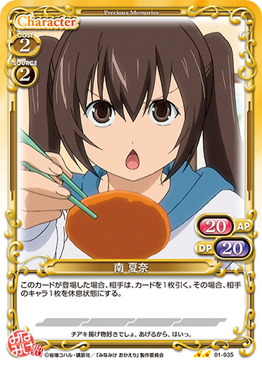 | このカードが登場した場合、手札から『みなみけ』のキャラ1枚を休息状態で場に出すことができる。 | ||