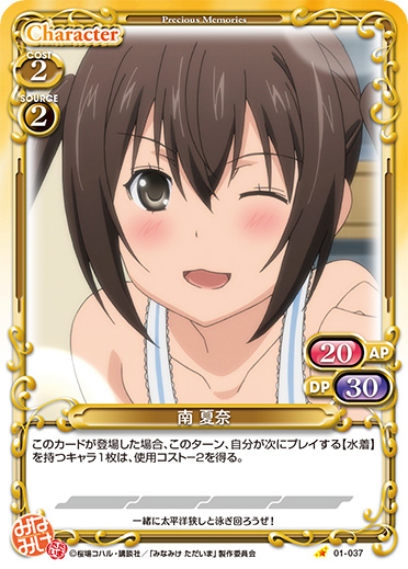 | このカードが登場した場合、このターン、自分が次にプレイする【水着】を持つキャラ1枚は、使用コスト-2を得る。 | ||