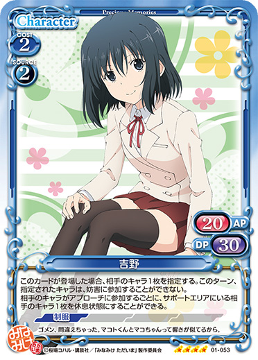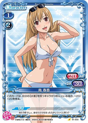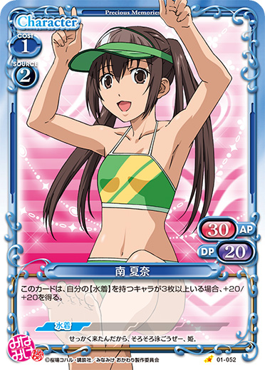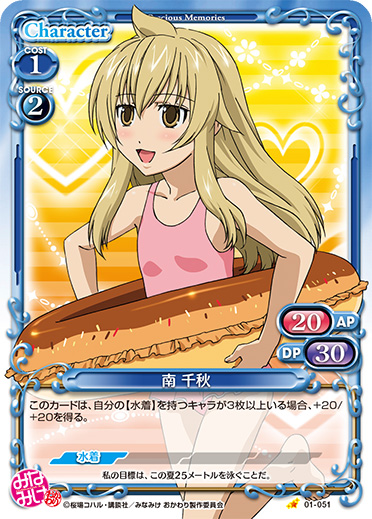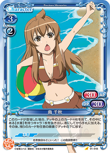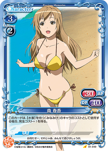 | このカードは、【水着】を持つ『みなみけ』のキャラのコストとして使用する場合、発生コスト+1を得る。 | ||