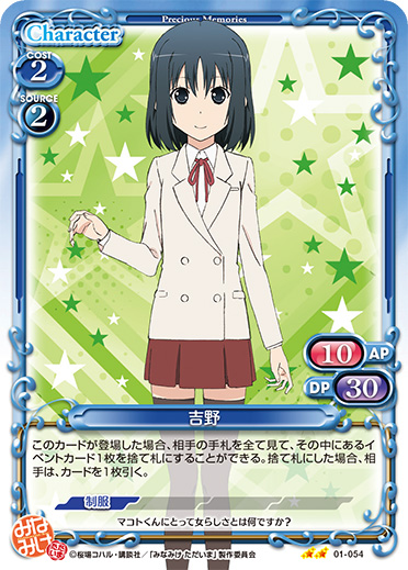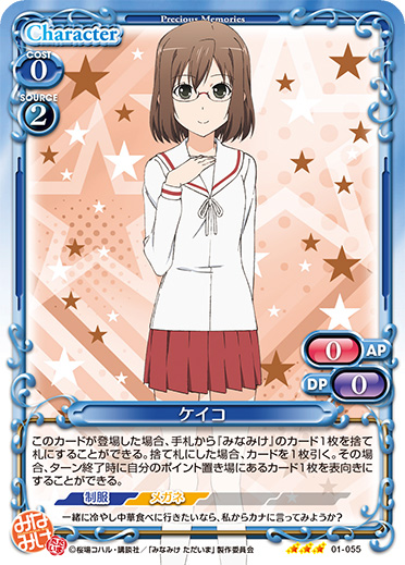 | このカードが登場した場合、手札から『みなみけ』のカード1枚を捨て札にすることができる。捨て札にした場合、カードを1枚引く。その場合、ターン終了時に自分のポイント置き場にあるカード1枚を表向きにすることができる。 | ||