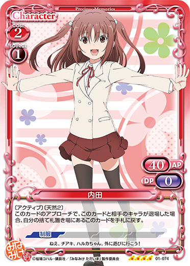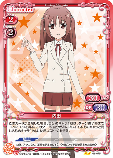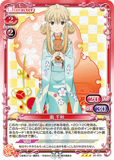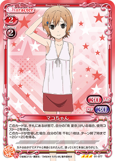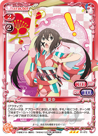 | このカードは、手札にある状態で、自分の「南 夏奈」がいる場合、使用コスト-2を得る。このカードが登場した場合、自分の「南 千秋」1枚は、ターン終了時まで+20/+20を得る。 | ||