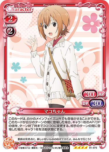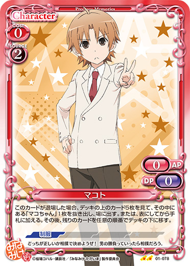 | このカードが退場した場合、デッキの上のカード5枚を見て、その中にある「マコちゃん」1枚を抜き出し、場に出す。または、表にしてから手札に加える。その後、残りのカードを任意の順番でデッキの下に移す。 | ||