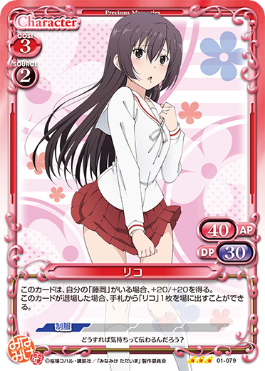 | このカードは、自分の「藤岡」がいる場合、+20/+20を得る。このカードが退場した場合、手札から「リコ」1枚を場に出すことができる。 | ||