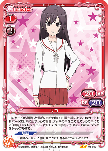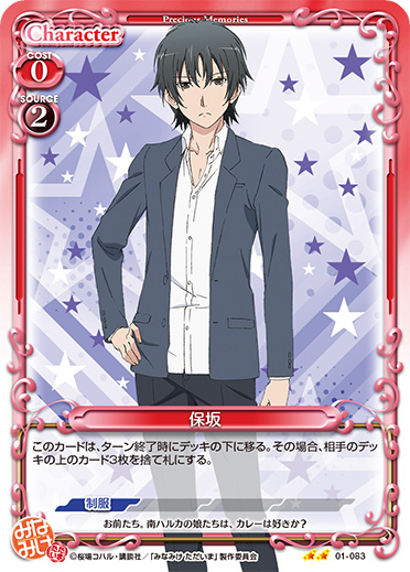 | このカードがアプローチでポイントを与えた場合、カードを2枚引く。このカードは、妨害された場合、ターン終了時まで+30/±0または±0/+30を得る。その後、妨害しているキャラの使用コストの値が2以下の場合、このカードは、ターン終了時まで+20/+20を得る。 | ||