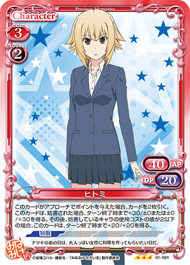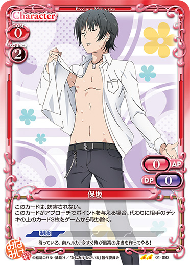| [アプローチ/自分]:《休》相手のキャラ1枚は、ターン終了時まで-10/±0を得る。 | ||