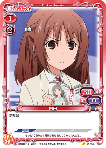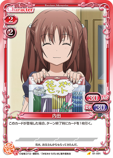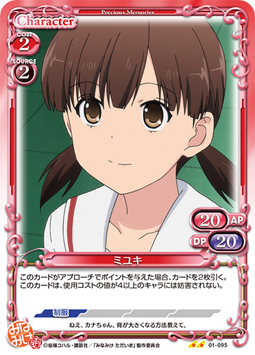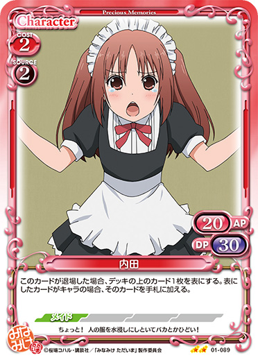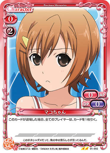 | このカードがアプローチでポイントを与えた場合、カードを2枚引く。このカードは、使用コストの値が4以上のキャラには妨害されない。 | ||