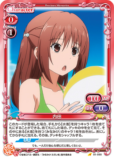 | このカードが登場した場合、手札から【水着】を持つキャラ1枚を捨て札にすることができる。捨て札にした場合、デッキの中を全て見て、その中にある【水着】を持つ『みなみけ』のキャラ1枚を抜き出し、表にしてから手札に加える。その後、デッキをシャッフルする。 | ||