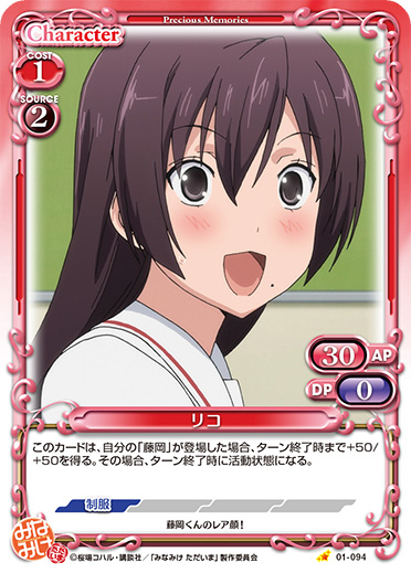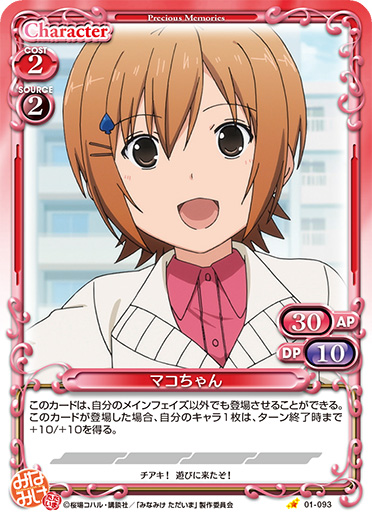 | このカードは、自分のメインフェイズ以外でも登場させることができる。このカードが登場した場合、自分のキャラ1枚は、ターン終了時まで+10/+10を得る。 | ||
