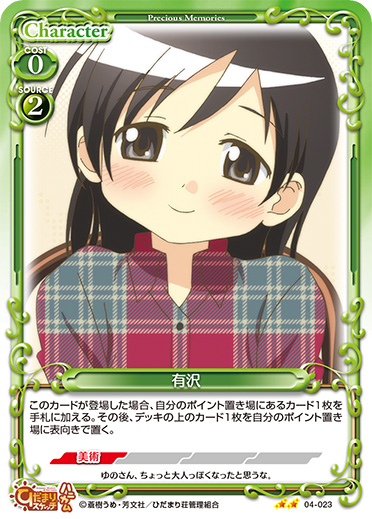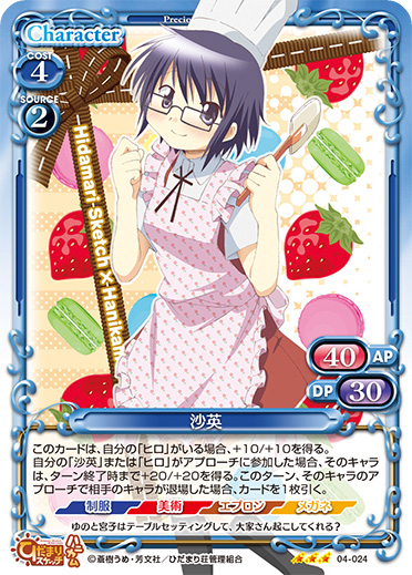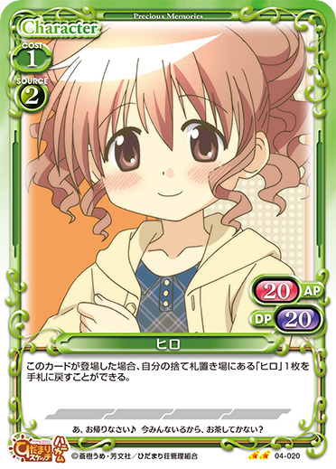 | このカードは、自分の『ひだまりスケッチ』のキャラが6枚以上いる場合、+30/+30を得る。自分の「ヒロ」が登場した場合、デッキの上のカード1枚を見て、そのカードをデッキの上または下に移す。 | ||