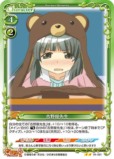 | 自分の全ての「吉野屋先生」は、+10/+10を得る。[メイン/自分]:《休》自分の「吉野屋先生」1枚は、ターン終了時まで〔アクティブ〕、+20/+10または〔天然2〕、+10/+20を得る。 | ||