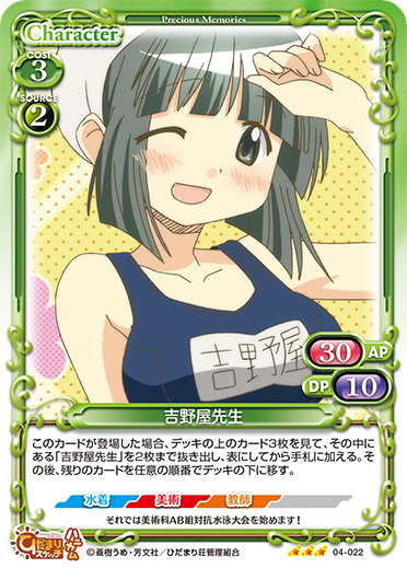 | このカードが登場した場合、デッキの上のカード3枚を見て、その中にある「吉野屋先生」を2枚まで抜き出し、表にしてから手札に加える。その後、残りのカードを任意の順番でデッキの下に移す。 | ||