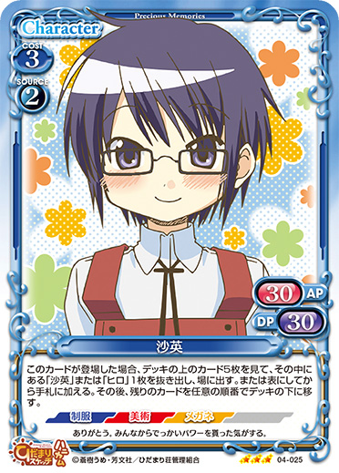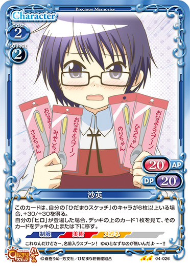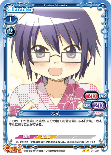 | このカードが登場した場合、自分の捨て札置き場にある「沙英」1枚を手札に戻すことができる。 | ||