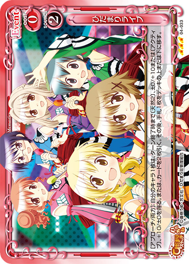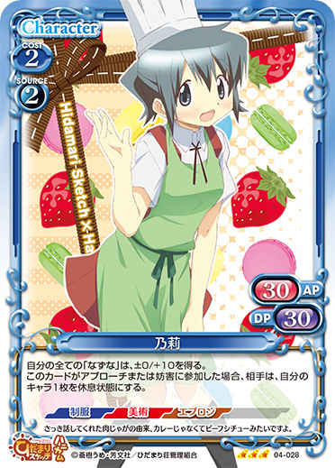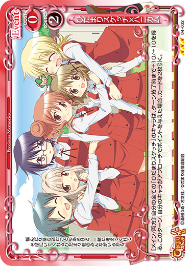 | [メイン/両方]:自分の全ての『ひだまりスケッチ』のキャラは、ターン終了時まで+10/+10を得る。このターン、自分のキャラがアプローチでポイントを与えた場合、カードを2枚引く。 | ||