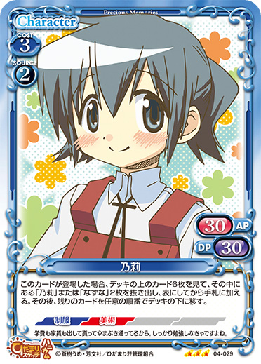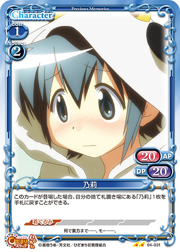 | このカードが登場した場合、自分の捨て札置き場にある「乃莉」1枚を手札に戻すことができる。 | ||
