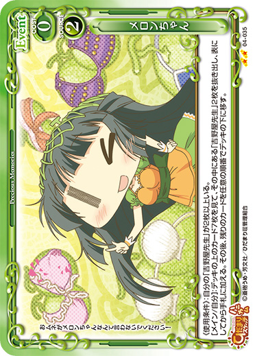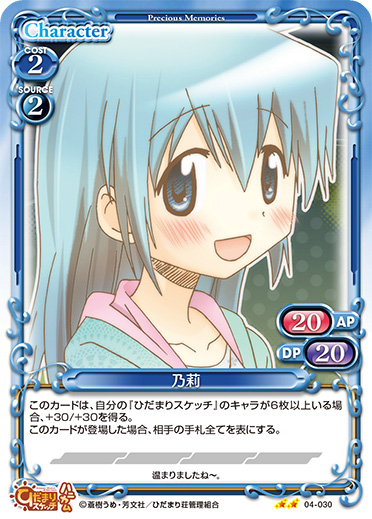 | このカードは、自分の『ひだまりスケッチ』のキャラが6枚以上いる場合、+30/+30を得る。このカードが登場した場合、相手の手札全てを表にする。 | ||