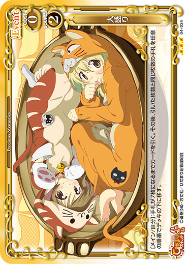 | このカードが登場した場合、デッキの上のカード6枚を見て、その中にある「乃莉」または「なずな」2枚を抜き出し、表にしてから手札に加える。その後、残りのカードを任意の順番でデッキの下に移す。 | ||