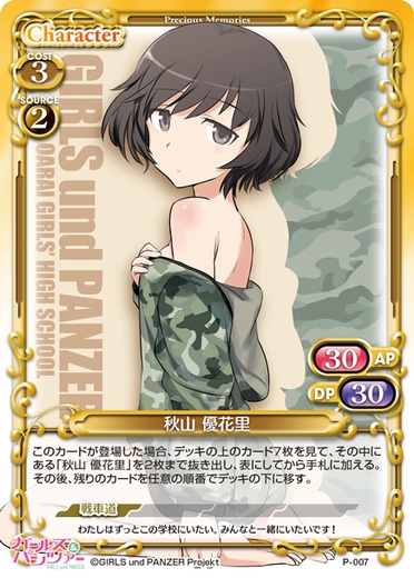 | このカードが登場した場合、デッキの上のカード7枚を見て、その中にある「秋山 優花里」を2枚まで抜き出し、表にしてから手札に加える。その後、残りのカードを任意の順番でデッキの下に移す。 | ||