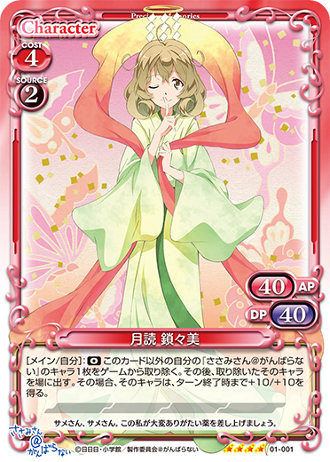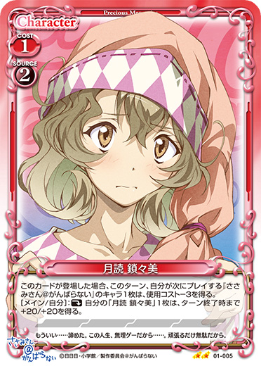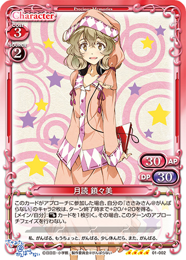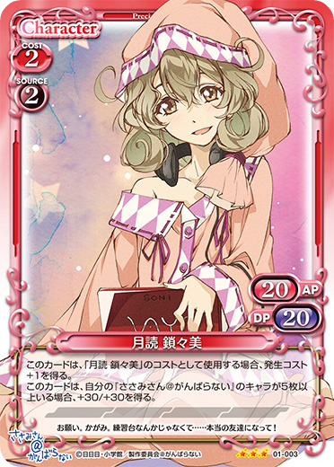 | このカードは、「月読 鎖々美」のコストとして使用する場合、発生コスト+1を得る。このカードは、自分の『ささみさん@がんばらない』のキャラが5枚以上いる場合、+30/+30を得る。 | ||