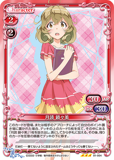 | このカードが登場、または相手のアプローチによって自分のポイント置き場に置かれた場合、デッキの上のカード5枚を見て、その中にある「月読 鎖々美」1枚を抜き出し、表にしてから手札に加える。その後、残りのカードを任意の順番でデッキの下に移す。 | ||