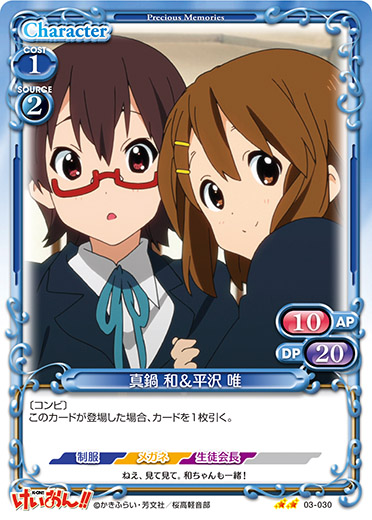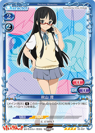 | [メイン/両方]:《1》このカードは、自分の【メガネ】を持つキャラ1枚につき、+10/+10を得る。 | ||