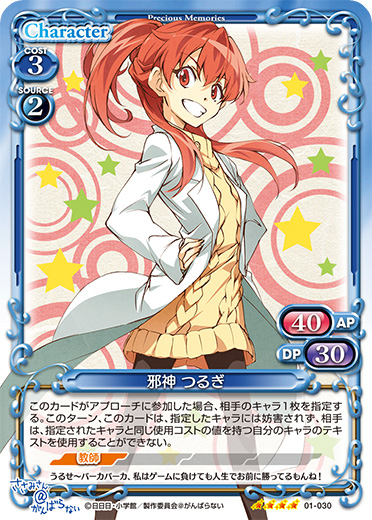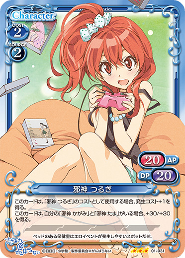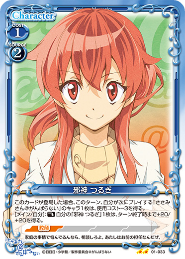 | このカードが登場した場合、このターン、自分が次にプレイする『ささみさん@がんばらない』のキャラ1枚は、使用コスト-3を得る。[メイン/自分]:《休》自分の「邪神 つるぎ」1枚は、ターン終了時まで+20/+20を得る。 | ||