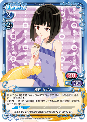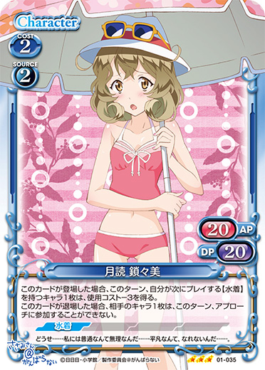 | このカードが登場した場合、このターン、自分が次にプレイする【水着】を持つキャラ1枚は、使用コスト-3を得る。このカードが退場した場合、相手のキャラ1枚は、このターン、アプローチに参加することができない。 | ||