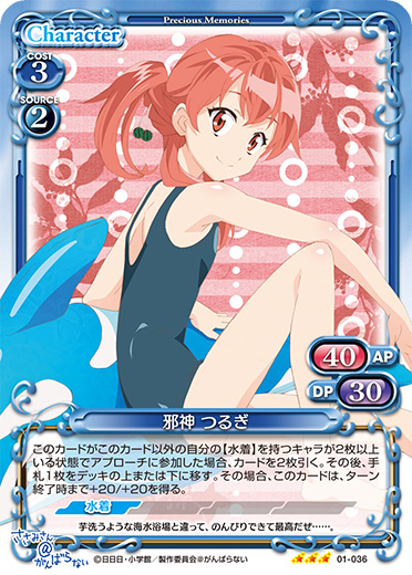 | このカードがこのカード以外の自分の【水着】を持つキャラが2枚以上いる状態でアプローチに参加した場合、カードを2枚引く。その後、手札1枚をデッキの上または下に移す。その場合、このカードは、ターン終了時まで+20/+20を得る。 | ||