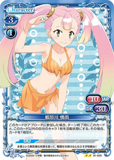 | このカードは、自分の「蝦怒川 情雨」がいる場合、+30/+30を得る。[メイン/自分]:《休》自分の【水着】を持つキャラ1枚は、ターン終了時まで+20/+20を得る。 | ||