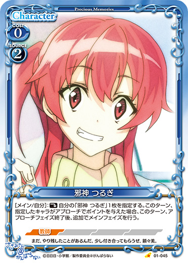| [メイン/自分]:《休》自分の「邪神 つるぎ」1枚を指定する。このターン、指定したキャラがアプローチでポイントを与えた場合、このターン、アプローチフェイズ終了後、追加でメインフェイズを行う。 | ||