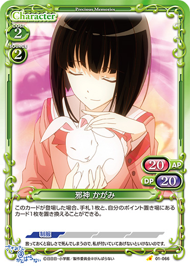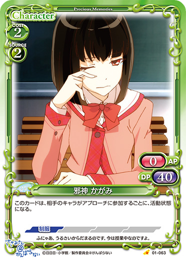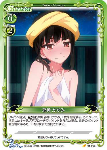 | [メイン/自分]:《休》自分の「邪神 かがみ」1枚を指定する。このターン、指定したキャラがアプローチでポイントを与えた場合、自分のポイント置き場にあるカードを2枚まで表向きにする。 | ||
