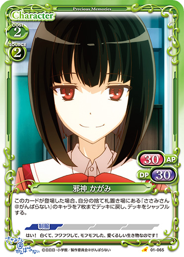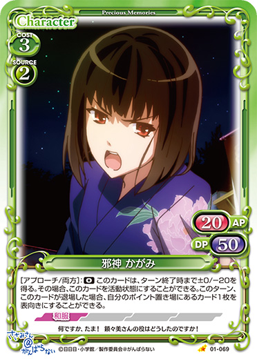| このカードが登場した場合、このターン、自分が次にプレイする「邪神 かがみ」1枚は、使用コスト-2を得る。 | ||