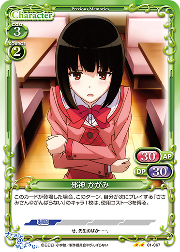 | このカードが登場した場合、このターン、自分が次にプレイする『ささみさん@がんばらない』のキャラ1枚は、使用コスト-3を得る。 | ||