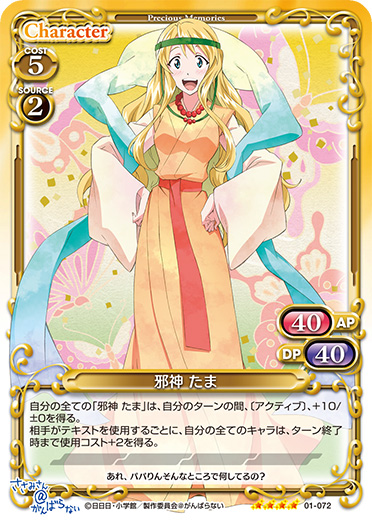 | このカードは、「邪神 たま」のコストとして使用する場合、発生コスト+1を得る。このカードは、赤と青と緑の自分のキャラがいる場合、+40/+20を得る。 | ||
