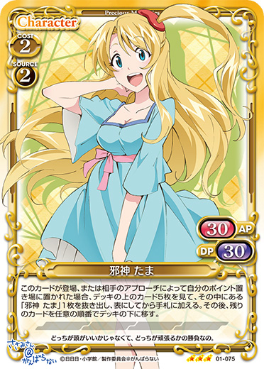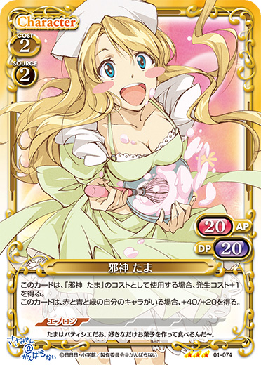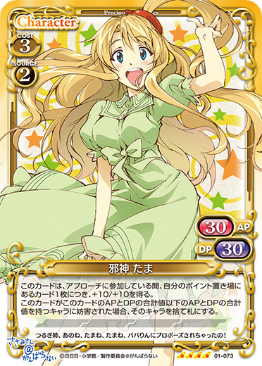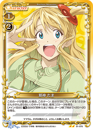| このカードが登場した場合、このターン、自分が次にプレイする『ささみさん@がんばらない』のキャラ1枚は、使用コスト-3を得る。[メイン/自分]:《休》自分の「邪神 たま」1枚は、ターン終了時まで+20/+20を得る。 | ||