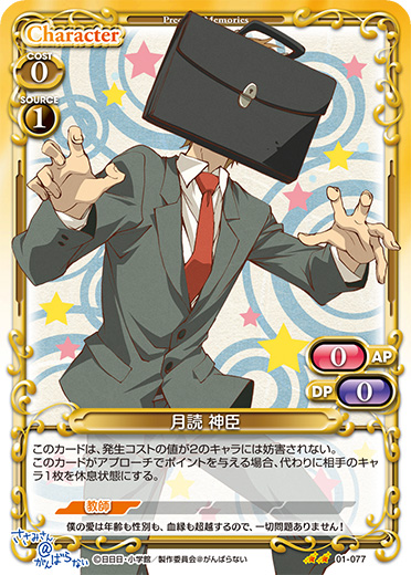 | このカードは、アプローチに参加している間、自分のポイント置き場にあるカード1枚につき、+10/+10を得る。このカードがこのカードのAPとDPの合計値以下のAPとDPの合計値を持つキャラに妨害された場合、そのキャラを捨て札にする。 | ||