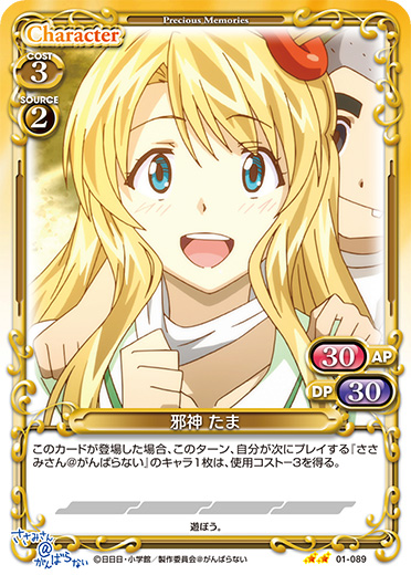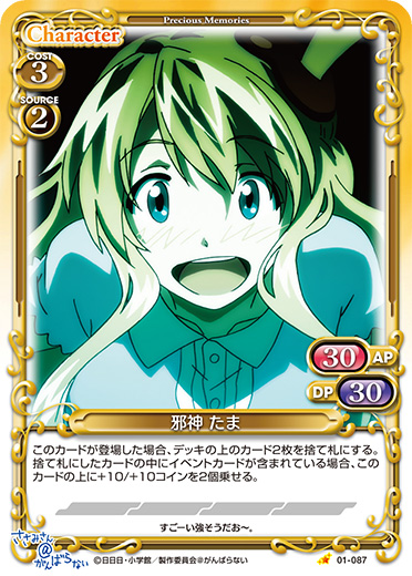 | このカードが登場した場合、このターン、自分が次にプレイする「邪神 たま」1枚は、使用コスト-2を得る。 | ||