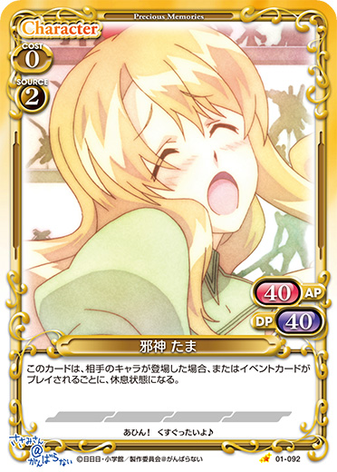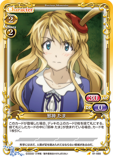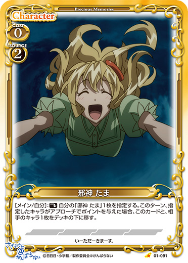| [メイン/自分]:《休》自分の「邪神 たま」1枚を指定する。このターン、指定したキャラがアプローチでポイントを与えた場合、このカードと、相手のキャラ1枚をデッキの下に移す。 | ||
