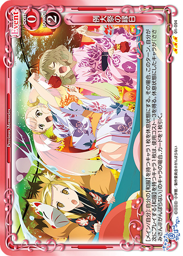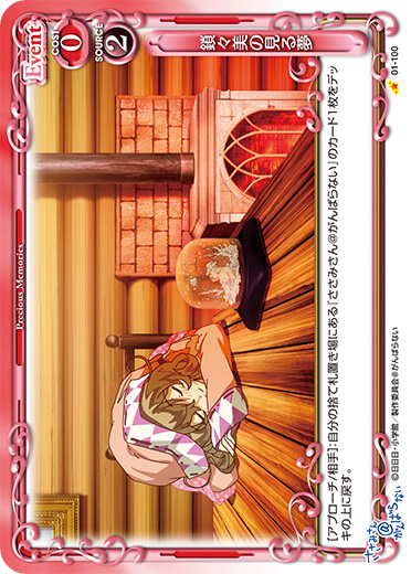 | [メイン/自分]:自分の【和服】を持つキャラ1枚を休息状態にする。その場合、このターン、自分が次にプレイする【和服】を持つキャラ1枚は、使用コスト-3を得る。休息状態にしたキャラが『ささみさん@がんばらない』のキャラの場合、カードを1枚引く。 | ||